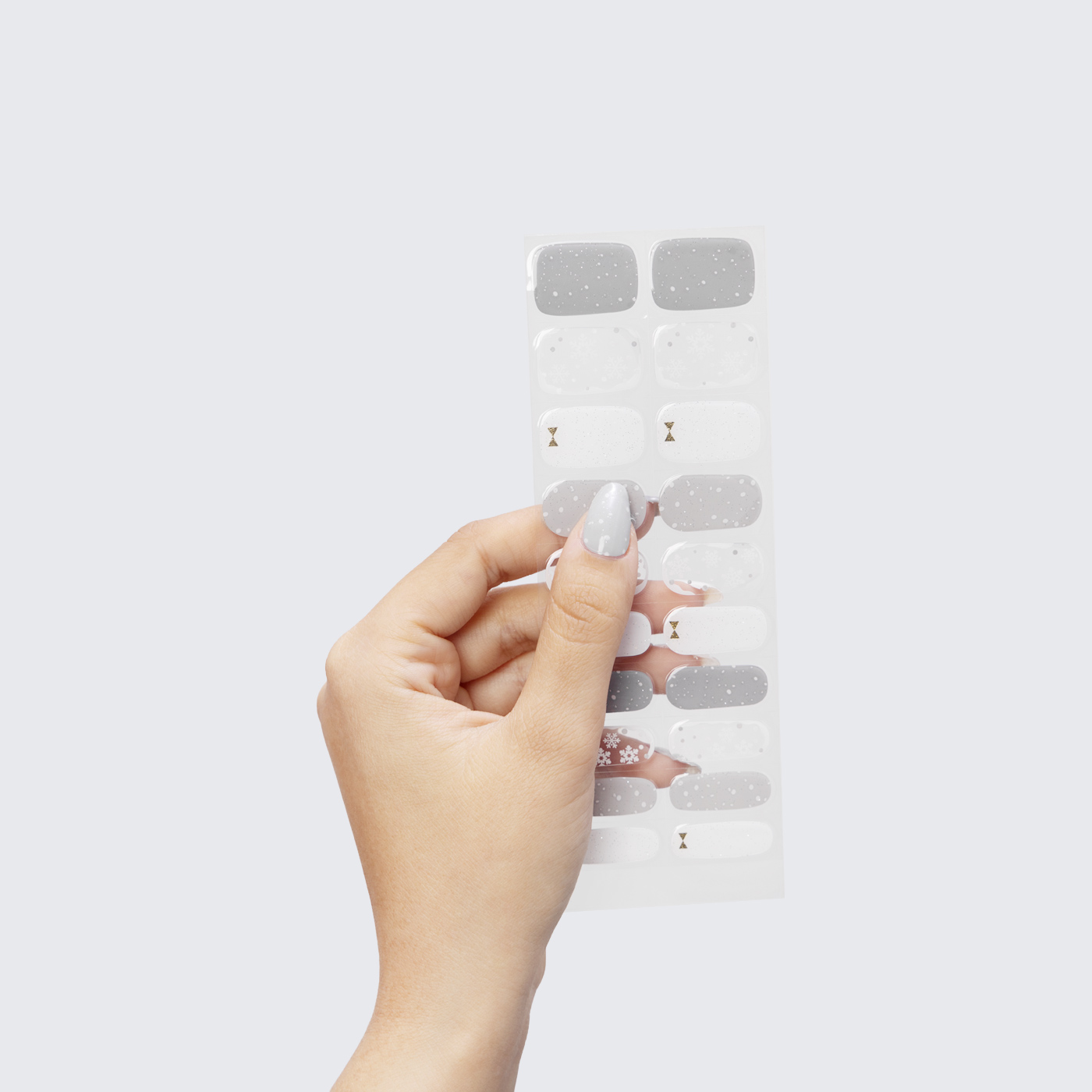 Translucent base. White snowflake detailing with white & silver polka dots. Neutral undertone.