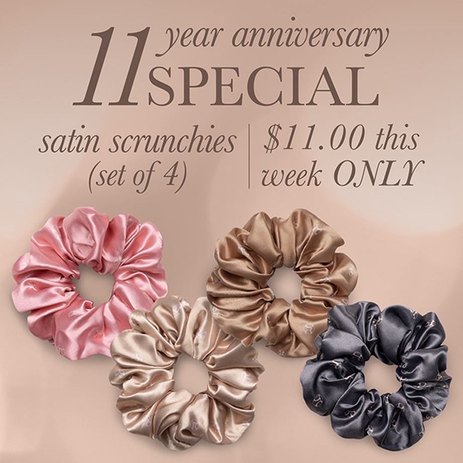 This assorted pack of 4 contains 1 charcoal, 1 pink, 1 rich cream, and 1 golden satin scrunchie.
